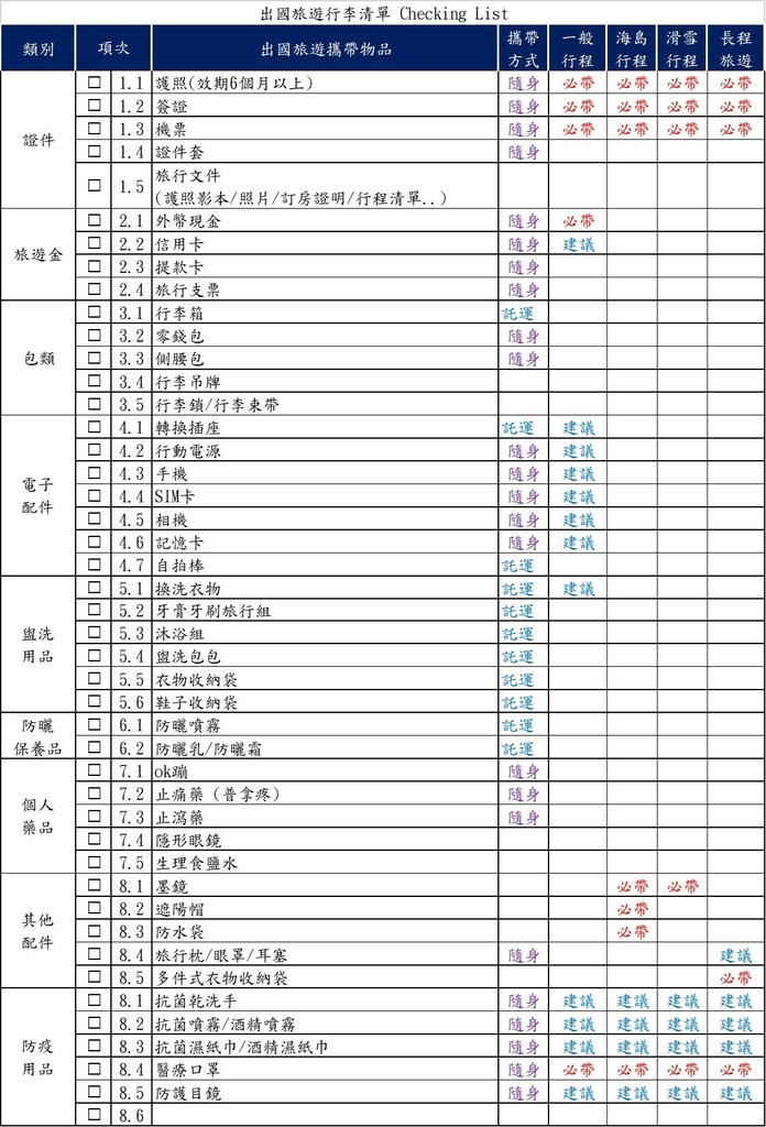 一.旅遊行前準備/出國旅遊行李清單Checklist